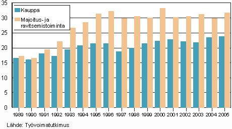 Kuvio 2. Osa-aikaisten osuus palkansaajista kaupan sekä majoitus- ja ravitsemistoiminnan aloilla 1989 - 2005 (%)