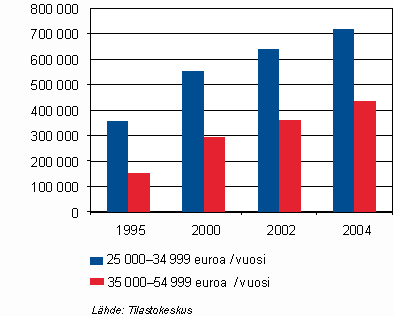 Näitä keskituloisia oli toissa vuonna jo 1 150 000, kun vuonna 1995 heidän lukumääränsä oli runsaat 500 000. Inflaatio ja tuloverotuksen muutokset vaikuttavat näin määritellyn keskiluokan todellisen ostovoiman kehitykseen yli ajan. Kuluttajahintaindeksi nousi vuosina 1995-2005 yhteensä vajaat 15 prosenttia, mutta oleellisempi ja toisensuuntainen muutos tapahtui verotuksessa: tuloveroaste aleni samalla aikavälillä 6-7 prosenttiyksikköä, mikä lisäsi ostovoimaa merkittävästi. Suomalainen keskiluokka on siten laajentunut ja vaurastunut. Näyttää myös siltä, että tähän keskituloisten joukkoon on noustu alemmista tuloryhmistä. Alle 25 000 euroa vuodessa ansaitsevien määrä on tällä vuosikymmenellä vähentynyt yli 200 000 hengellä.