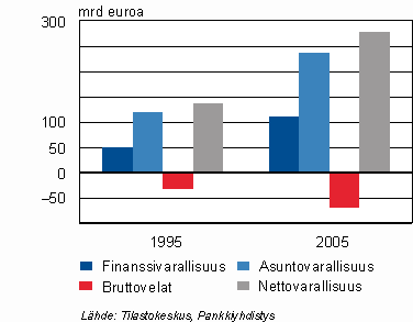 Kotitalouksien velkojen määrä on vuoden 1995 jälkeen kasvanut noin 37 miljardilla eurolla, ja viime vuoden lopussa lainakanta oli lähes 70 miljardia. Lisää finanssivarallisuutta on saman kymmenvuotisjakson aikana kertynyt noin 60 miljardia. Asuntojen nimellishintojen kaksinkertaistuminen on nostanut asuntovarallisuuden markkina-arvoa lähes 120 miljardilla eurolla.