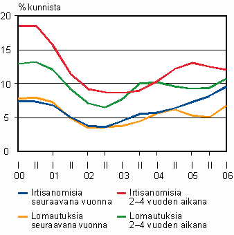 Vuodet 2008-10 näyttävät kuntapäättäjien arvioissa ensi vuotta heikommilta irtisanomisten, kuten lomautustenkin suhteen. Sama vastaamisen tapa on vallinnut kysymyksen suhteen aikaisemminkin. Vuosikymmenen alussa arviot olivat pitemmällä aikavälillä tätäkin synkemmät. Muut keinot kuin irtisanomiset ja lomautukset ovat kuntien palvelurakenteiden uudistamisessa kuitenkin keskeisimpiä.