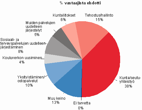 Kunta- tai seutuyhteistyö mainittiin lähes 350 kertaa ja kuntien yhteispalvelut noin sata kertaa. Esimerkkejä ehdotuksista: isäntäkuntamallin käyttöönotto, kuntayhteistyö "vapaaehtoisilla" hallinnonaloilla, kuntayhteistyö samankokoisen kunnan kanssa, palvelujen tehostaminen ns. kuntaparitoiminnalla, kuntien yhteistoiminta tilaaja-tuottaja-mallia käyttäen, perusterveydenhuollon ja kirjastotoimen muuttaminen seudulliseksi, verkostokaupunkiyhteistyö...