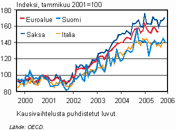 Euromaiden kasvuerot ovat olleet viime vuosina tuntuvia, mutta hitaan ja nopean kasvun taustatekijät ovat erilaisia (Kuvio 1). Saksassa tuotannon kasvua on hidastanut kotimainen kysyntä, kun taas Italian heikon menestyksen taustalla ovat olleet viennin vaikeudet (Kuvio 2).