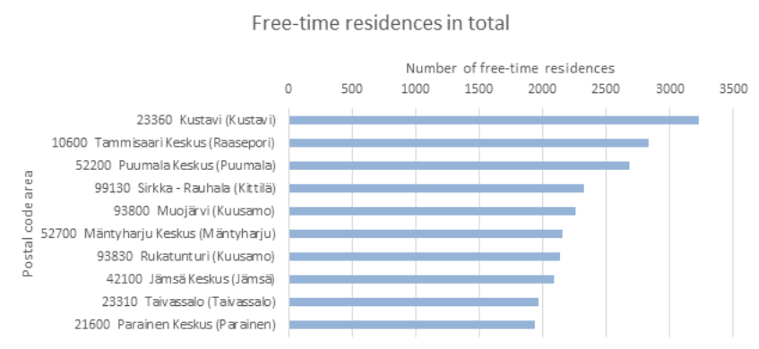 As an example of data by postal code area, the number of free-time residences in 2024 was extracted for the figure below. The number of free-time residences was highest in the postal code area of Kustavi, over 3,000. There are plenty of other interesting things to explore in the Paavo service.