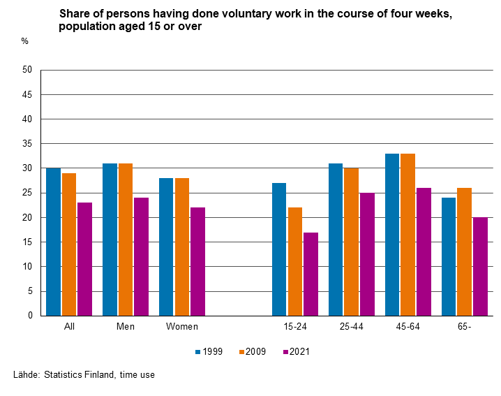Culture, media and time useAccording to Statistics Finland's data, participation in voluntary work has decreased from 2009. Participation in voluntary work had decreased among both men and women and in all age groups during the pandemic. Most voluntary work was done in housing company activities, neighbourhood associations and village committees. 60 % of the population aged 15 or over had helped another household free of charge or against a small compensation in the course of the past four weeks. Help most often concerned shopping and running errands. Households received considerably less help than 10 years ago.