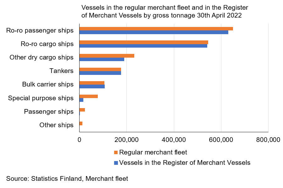 Transport and tourismIn April 2022, the size of the Finnish merchant fleet was 1,236 vessels. The regular merchant fleet included 671 vessels and the number of small vessels was 281. The number of barges and other engineless vessels was 284 in total. The gross tonnage of the entire registered merchant fleet was 1,933,291. These figures are preliminary data from Statistics Finlands merchant fleet statistics.
