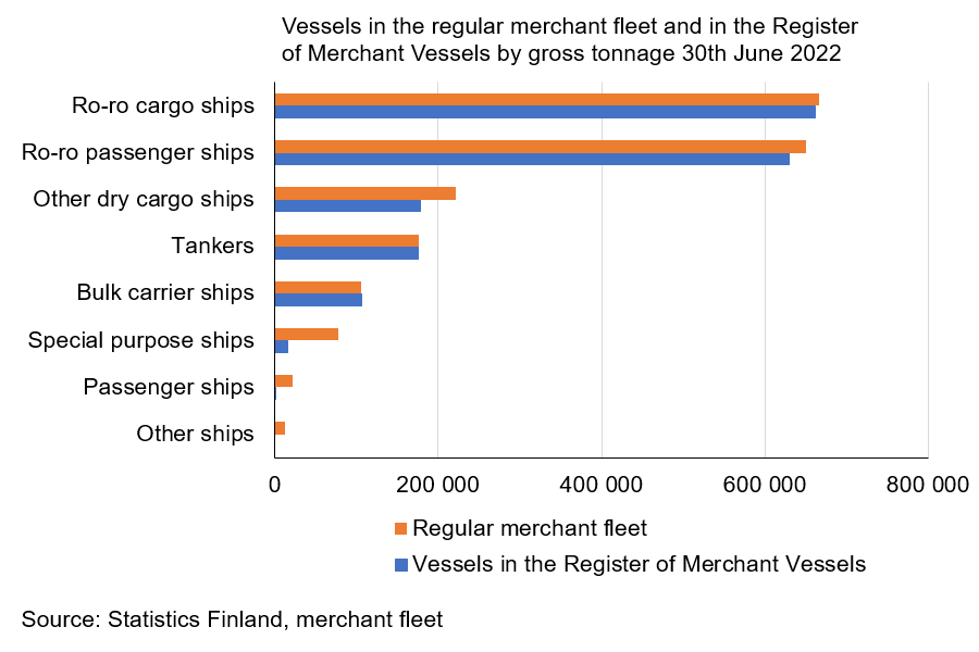 Transport and tourismAccording to Statistics Finland's preliminary data, in June 2022, the size of the Finnish merchant fleet was 1,239 vessels. The regular merchant fleet included 674 vessels and the number of small vessels was 281. The number of barges and other engineless vessels was 284 in total. The gross tonnage of the entire registered merchant fleet was 2,044,310.