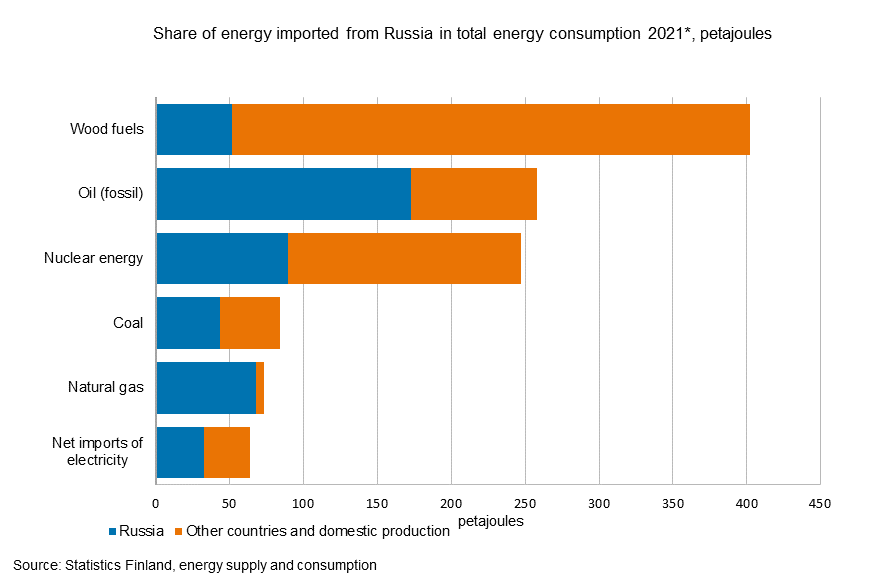 review | Energy supply and consumption 31.12.2021Statistics Finland and the Natural Resources Institute Finland calculated in collaboration the share of energy imported from Russia in total energy consumption by energy source. According to preliminary data, energy imported from Russia accounted for 34 per cent of Finland's total energy consumption in 2021. As expected, the share of natural gas was highest, 92 per cent.