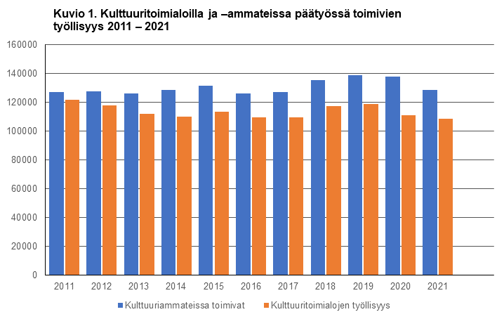 - Kulttuuriammateissa päätoimessa työskenteleviä oli vuonna 2021 noin 128 000.
