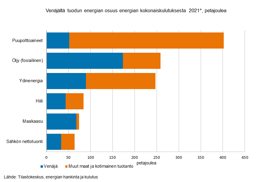 Venäjän aloittaman hyökkäyksen jälkeen Tilastokeskus on saanut runsaasti kyselyjä venäläiseen tuontienergiaan liittyen. Energian tuonnin lisäksi on kaivattu tietoa siitä, kuinka suuri osuus Suomen energian kokonaiskulutuksesta on alun perin Venäjältä peräisin. Tilastokeskus on yhdessä Luonnonvarakeskuksen kanssa ensimmäistä kertaa laskenut energialähteittäin Venäjän tuonnin osuuden energian kokonaiskulutuksesta.
