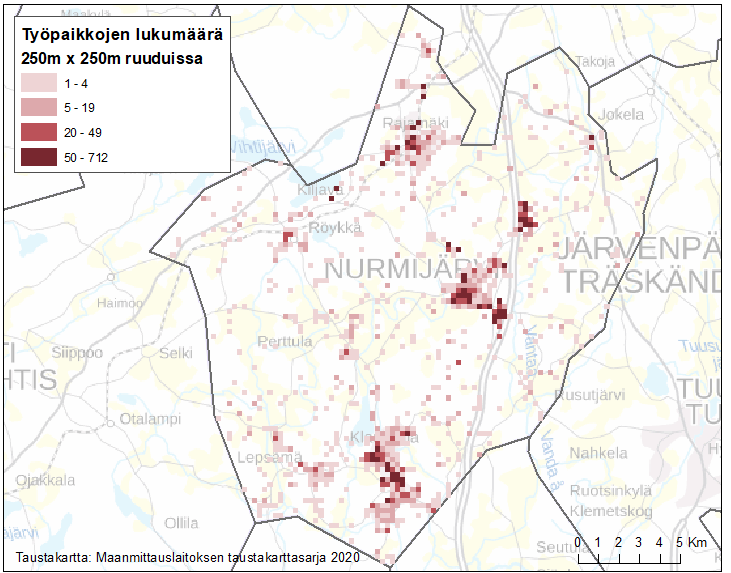 Oheinen kartta havainnollistaa tarkasti, minne työpaikat ovat Nurmijärvellä keskittyneet.