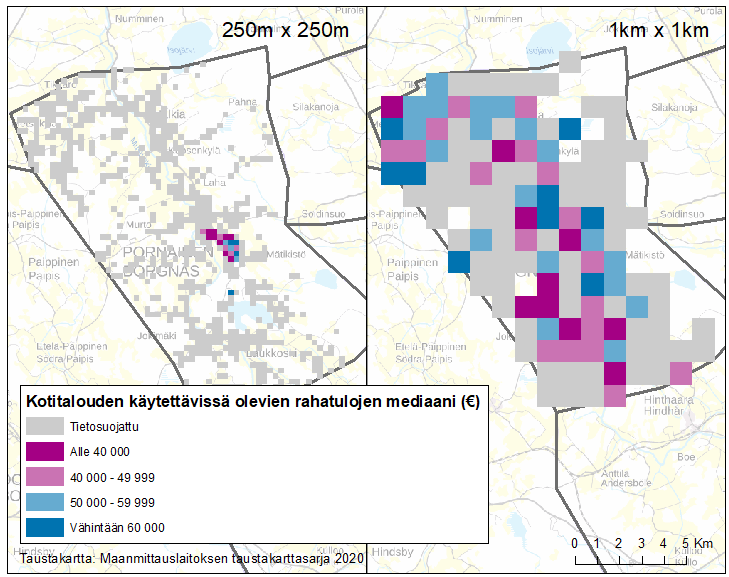 Tietosuojasyistä tietoryhmän muut tiedot on salattu, jos perusjoukossa on vain vähän tapauksia. Esimerkiksi kotitalouksien tulotiedot on suojattu, jos ruudussa on alle 10 kotitaloutta. Siksi haja-asutusalueilla 1km-ruudut sopivat tarkastelun mittakaavaksi paremmin kuin 250m-ruudut. Alla olevissa kartoissa on esitetty kotitalouksien mediaanitulot Pornaisissa kahdella ruutukoolla.