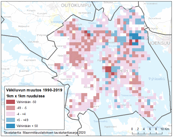 Ruututietokannan tietoryhmistä on saatavilla tietoja 1990-luvulta alkaen ja tilastoruudukko on hallinnollisista aluejaoista riippumaton, joten ruutuaineistot soveltuvat hyvin myös ajallisten muutosten analysoimiseen. Oheinen kartta kuvaa 1km:n ruuduilla absoluuttista väkimäärän muutosta Liperissä vuosina 1990-2019.