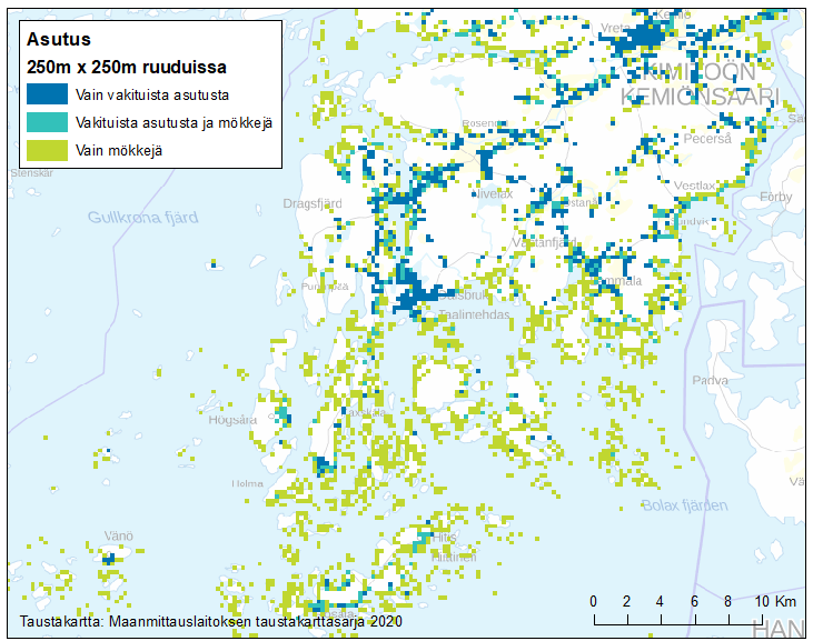 Yhdistämällä tietoja useasta muuttujasta tai tietoryhmästä aineistoista saa enemmän irti. Alla olevassa kartassa on tarkasteltu erityyppistä asutusta Kemiönsaaressa yhdistämällä tieto vakituisesta asumisesta (asukkaat yhteensä -muuttuja) ja mökkien sijainnista (kesämökit-muuttuja).