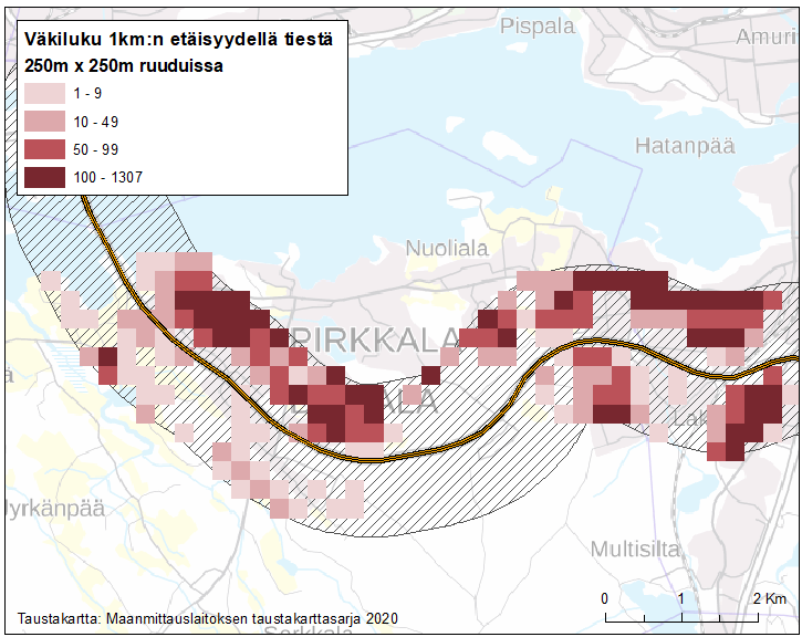 Ruutujen avulla voi helposti summata muuttujia omille aluejaoille tai vaikkapa tarkastella tietoja tietyllä etäisyydellä valitusta kohteesta. Esimerkiksi oheiseen karttaan on poimittu kilometrin säteellä Tampereen kehätiestä sijaitsevat ruudut Pirkkalassa.