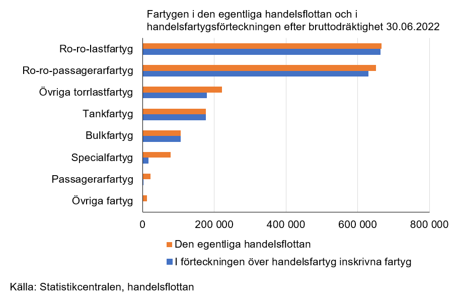 Transport och turismEnligt Statistikcentralens preliminära uppgifter till Finlands handelsflotta hörde i juni 2022 totalt 1 239 fartyg. Till den egentliga handelsflottan hörde 674 fartyg och till småfartygen 281 fartyg. Antalet pråmar och övriga fartyg utan framdrivningsmaskineri uppgick till totalt 284 fartyg. Bruttodräktigheten för hela den registrerade handelsflottan var 2 044 310.