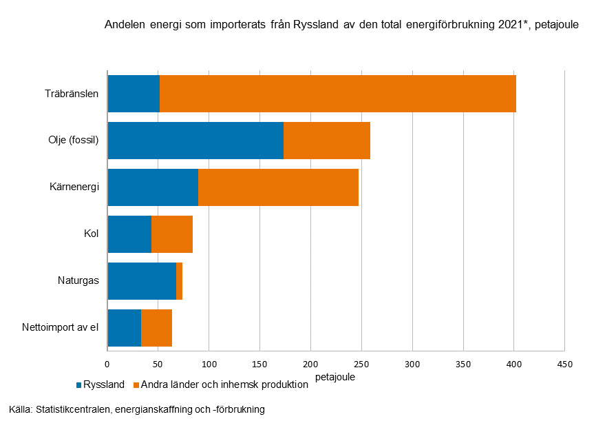 översikt | Energianskaffning och -förbrukning 31.12.2021Statistikcentralen och Naturresursinstitutet har i samarbete beräknat andelen energi som importerats från Ryssland av den totala energiförbrukningen efter energikälla. Enligt de preliminära uppgifterna täckte den energi som importerades från Ryssland 34 procent av Finlands totala energiförbrukning 2021. När det gäller naturgas var andelen som väntat den högsta, 92 procent.