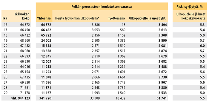Suomessa on 52 000 alle 30-vuotiasta, jotka eivät opiskele, ole työssä, eläkkeellä tai varusmiehenä ja joilla ei toistaiseksi ole perusastetta korkeampaa koulutusta (Taulukko 1). Joukossa on myös 7 000 naista, joilla on alle kouluikäisiä lapsia.