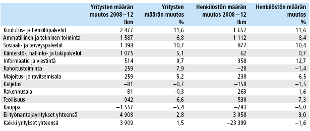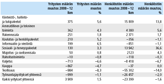 Yksityisten yritysten työllisyys on kohonnut vuosina 2008 – 12 eniten kiinteistö-, hallinto- ja tukipalveluissa sekä sosiaali- ja terveyspalveluissa. Hallinto- ja tukipalveluissa merkittävä osa henkilöstön kasvusta on koostunut kuitenkin henkilöstön vuokrauksesta, mikä on pienentänyt työllisyyden todellista kasvua vuokratyövoimaa käyttävillä toimialoilla, kuten hotelli- ja ravitsemusalalla.