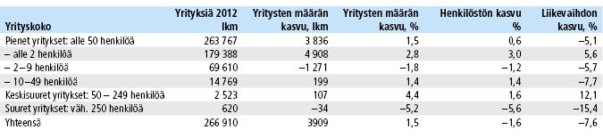 Taulukko 3. Yritysten, henkilöstön ja liikevaihdon määrän muutokset yritysten kokoluokittain 2008 – 2012 (pl. alkutuotanto). (Klikkaa kuva isommaksi)