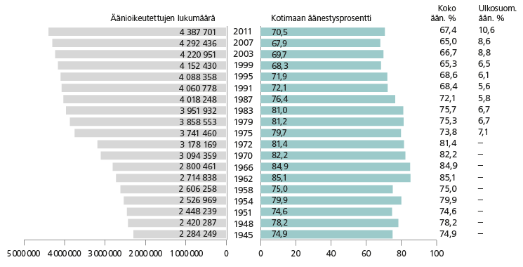 Kuvio 1. Eduskuntavaalien 1945– 2011 äänioikeutetut ja äänestysprosentit (Klikkaa kuva isommaksi)