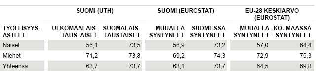 Ulkomailla syntyneiden 20 – 64-vuotiaiden naisten työllisyysaste oli Suomessa vuonna 2014 itse asiassa samaa tasoa kuin kantaväestön naisten työllisyysaste useissa Etelä- ja Itä-Euroopan maissa. Sekä ulkomailla syntyneiden että ulkomaalaistaustaisten naisten työllisyysaste oli Suomessa vuonna 2014 korkeampi kuin kantaväestön naisten työllisyysaste Kreikassa, Espanjassa, Kroatiassa, Italiassa ja Maltalla (44,3 – 55,3 %), ja lähes yhtä korkea kuin kantaväestön naisten työllisyysaste Unkarissa, Puolassa, Romaniassa ja Slovakiassa (57,3 – 60,2 %).