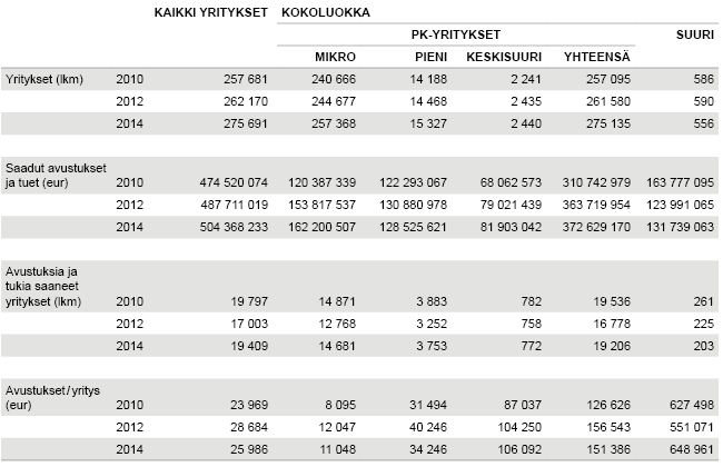 Taulukko 1. Avustukset ja tuet yritysten kokoluokittain vuosina 2010, 2012 ja 2014, Klikkaa kuva isommaksi