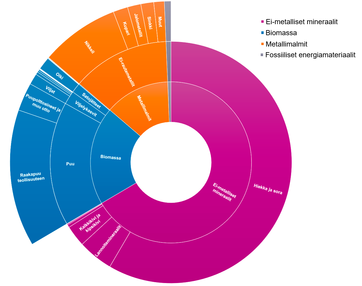 Kotimaiset suorat panokset luokitellaan biomassaan, metallimalmeihin, ei-metallisiin mineraaleihin sekä fossiilisiin energiamateriaaleihin. Kuviossa 1 on eritelty vuoden 2021 kotimaiset suorat panokset (jatkossa kotimainen otto) materiaaliluokittain.