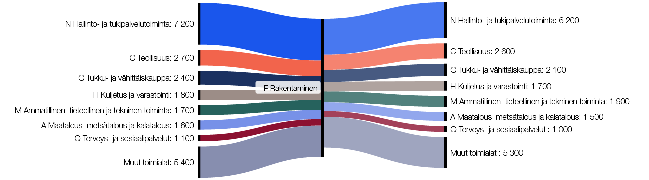 Kuviosta 5 nähdään, että rakentamisen toimialalle siirryttiin yleisimmin hallinto- ja tukipalvelutoimintojen (7 200), teollisuuden (2 700) sekä tukku- ja vähittäiskaupan (2 400) toimialoilta. Alalta poistuttiin myös yleisimmin vastaaville toimialoille; hallinto- ja tukipalvelutoiminta (6 200), teollisuus (2 600) sekä tukku- ja vähittäiskauppa (2 100).