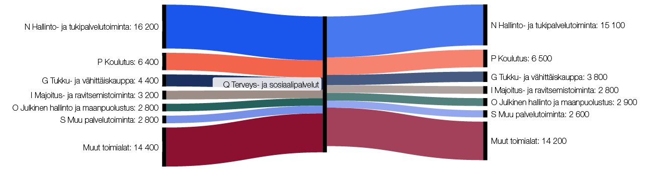 Terveys- ja sosiaalipalveluiden alalle siirryttiin yleisimmin hallinto- ja tukipalvelutoimintojen (16 200), koulutuksen (6 400) sekä tukku- ja vähittäiskaupan (4 400) toimialoilta (Kuvio 4). Alalta poistuttiin myös yleisimmin vastaaville toimialoille; hallinto- ja tukipalvelutoiminta (15 100), koulutus (6 500) sekä tukku- ja vähittäiskauppa (3 800).