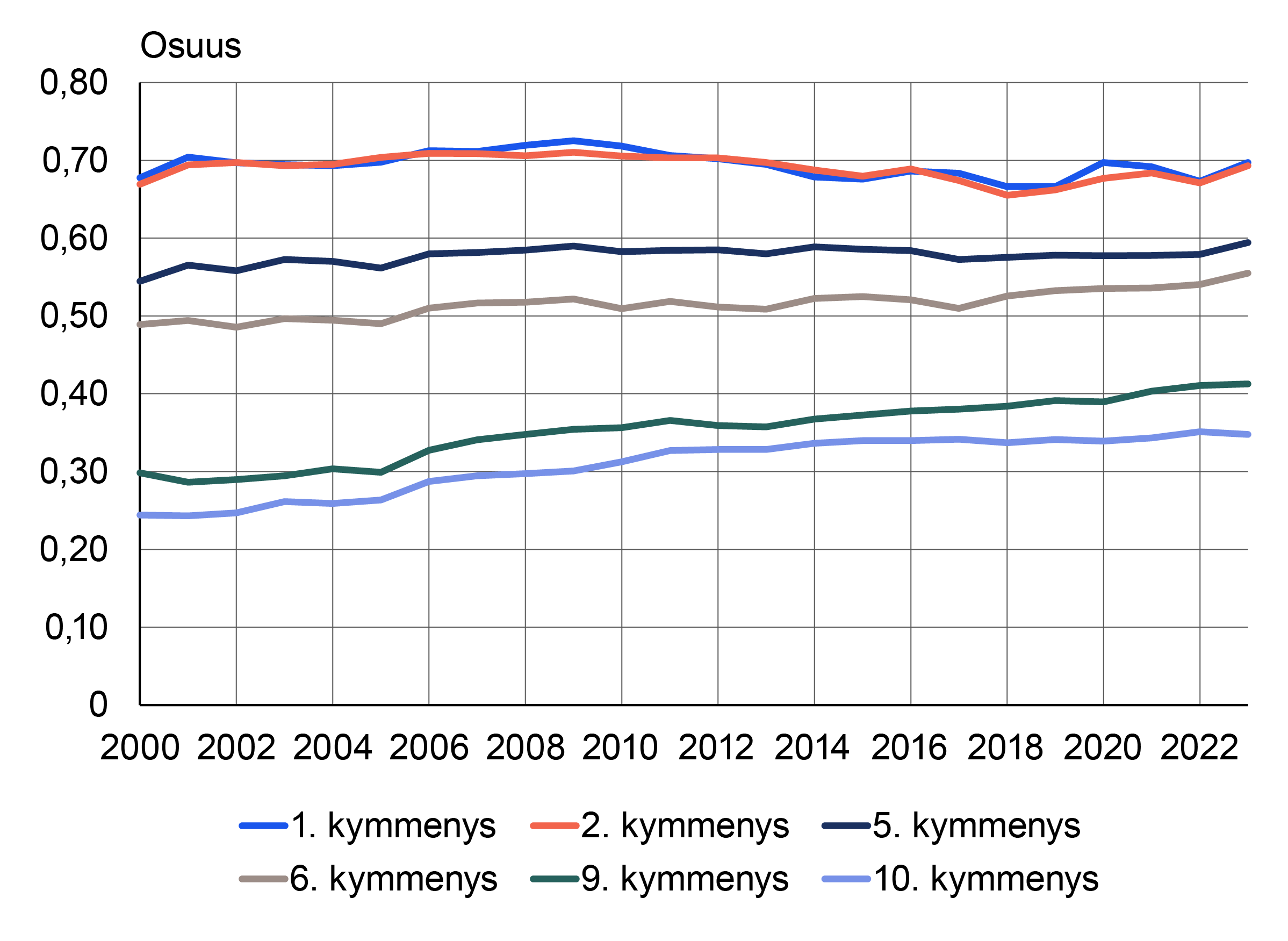 Naisten osuus kaikkein pienipalkkaisimpien ryhmässä on pysynyt koko 2000-luvun yllättävänkin vakaana. Sen sijaan naisten osuus ylimmissä palkkaryhmissä on kasvanut. Muutaman prosentin kavennus naisten ja miesten palkkaeroissa 2000-luvulla johtuukin lähinnä siitä, että naisten osuus ylimmissä palkkakymmenyksissä on kasvanut (kuvio 2).
