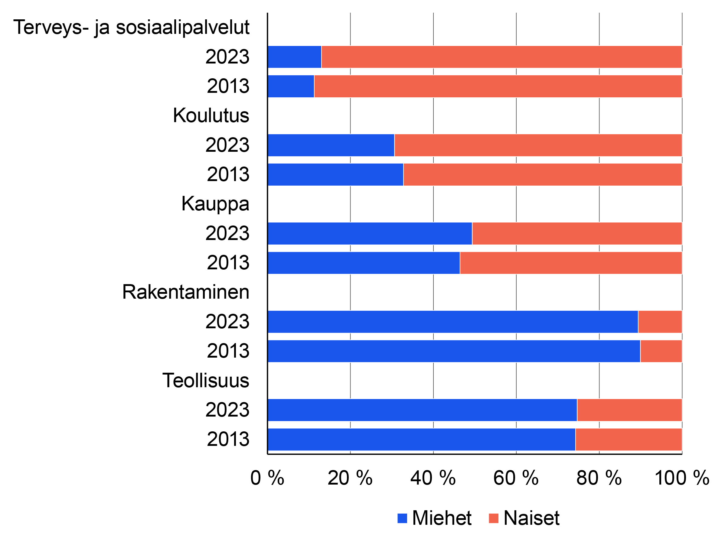 Naiset ja miehet sijoittuvat keskimäärin eri tavoin eri ammatteihin mutta myös eri toimialoille. Kuviossa 6 nähdään muutamien suurien toimialojen sukupuolijakauma ja miten se on muuttunut vuodesta 2013 vuoteen 2023.