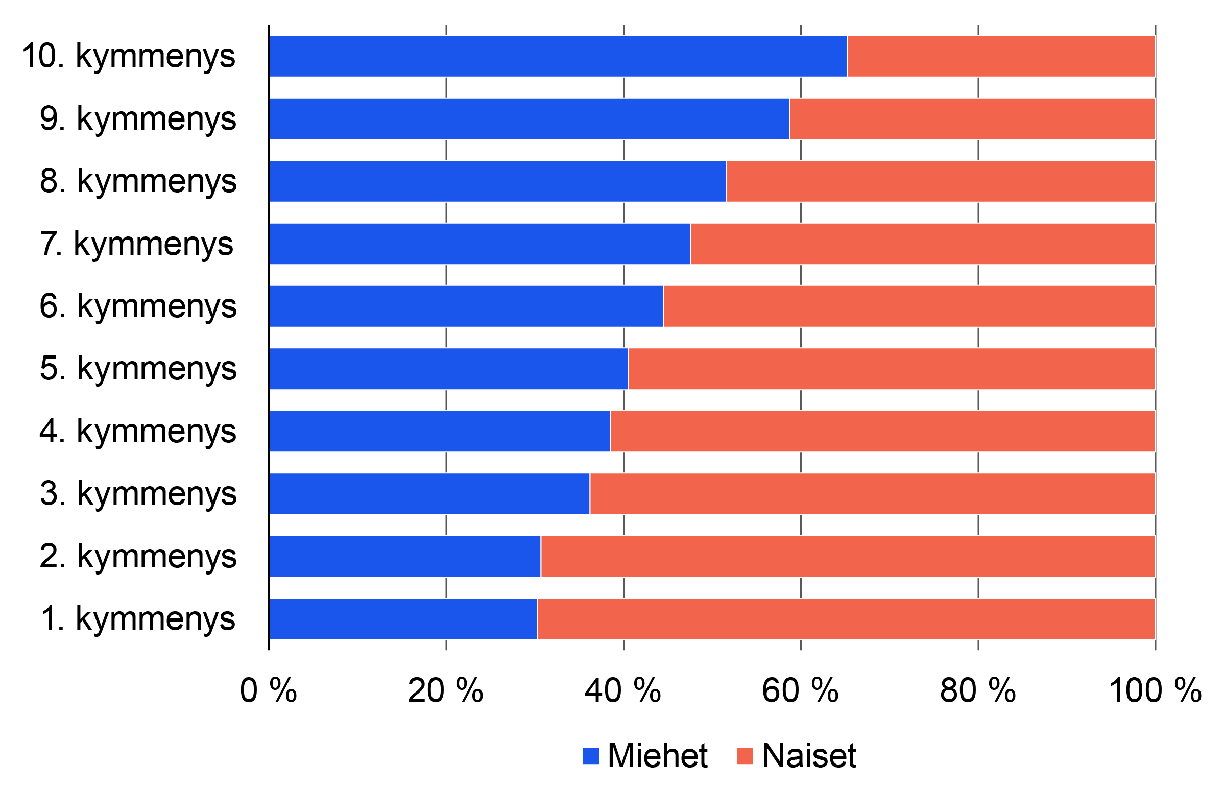 Keskimääräinen naisten ja miesten palkkaero kuitenkin pelkistää palkkaeron yhteen lukuun. Sen lisäksi on havainnollista esimerkiksi katsoa, miten naiset ja miehet sijoittuvat eri palkkakymmenyksiin. Kun palkansaajat järjestetään kymmeneen samankokoiseen ryhmään pienimpiä palkkoja ansaitsevista suurimpia palkkoja ansaitseviin, nähdään että kahdessa alimmassa palkkakymmenyksessä jopa 70 prosenttia palkansaajista on naisia. Kolmessa ylimmässä tulokymmenyksessä taas suurin osa palkansaajista on miehiä (kuvio 1).