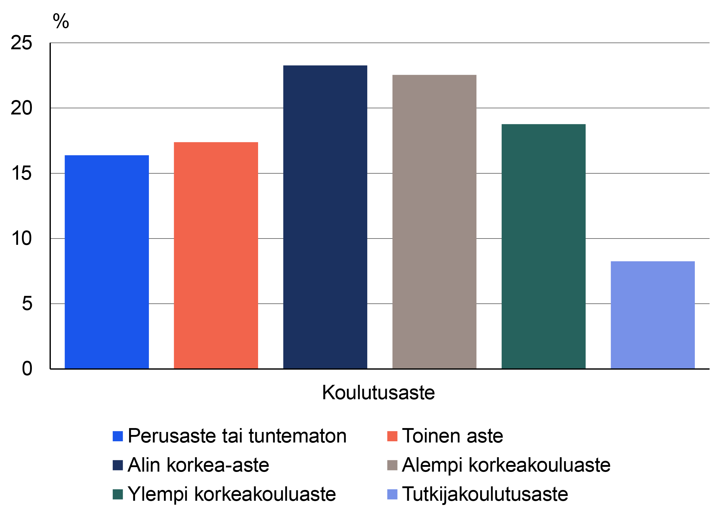 Naiset ovat Suomessa korkeammin koulutettuja kuin miehet. Käytännössä kaikissa työiässä olevista ikäryhmistä suurempi osuus naisista kuin miehistä on suorittanut vähintään alimman korkea-asteen tutkinnon. Esimerkiksi 35–39-vuotiaista naisista 51 prosenttia oli suorittanut korkeakoulututkinnon vuonna 2023. Saman ikäryhmän miehistä osuus oli vain 34 prosenttia.