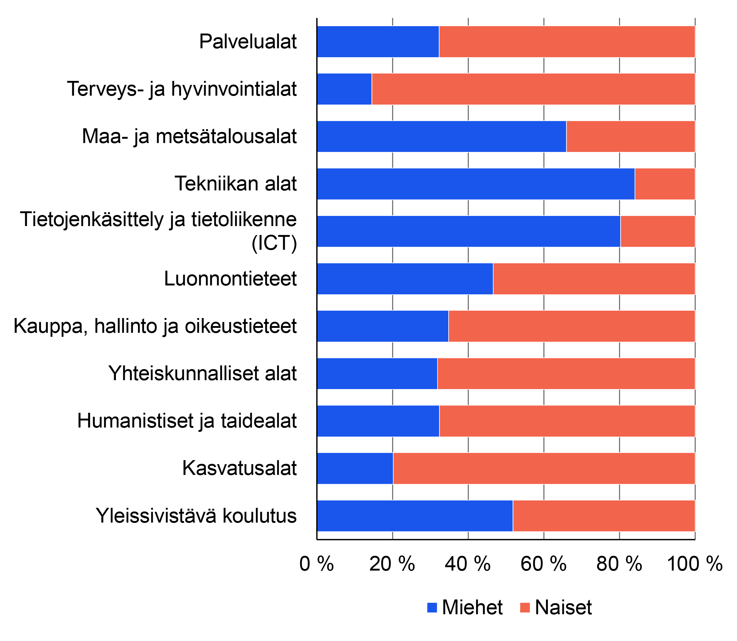 Alojen väliseen segregaatioon ei ole nähtävissä suuria muutoksia. Vuonna 2023 uusistakin terveys- ja hyvinvointialojen opiskelijoista 84 prosenttia oli naisia. Tekniikan aloilla taas 74 prosenttia ja tietojenkäsittelyn ja tietoliikenteen aloilla 72 prosenttia uusista opiskelijoista oli miehiä (koulutukseen hakeutuminen 2023).