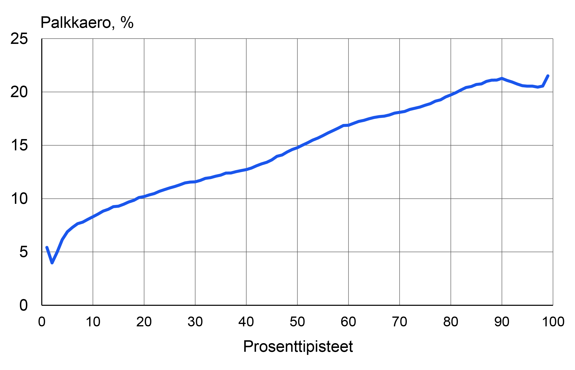 Prosenttipisteet kuvaavat palkansaajien ansioita siten, että heidät on järjestetty pienimpiä palkkoja ansaitsevista suurimpia palkkoja ansaitseviin. Kun verrataan naisten ja miesten prosenttipisteitä toisiinsa, palkkaero pääsääntöisesti kasvaa silloin kun jakaumassa liikutaan pienemmistä palkoista suurempiin palkkoihin. Esimerkiksi prosenttipisteessä 10 palkkaero naisten ja miesten palkassa on 8 prosenttia, kun prosenttipisteessä 90 se on 21 prosenttia (kuvio 3).