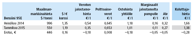 Taulukko 1. Bensiinin 95E hinnanmuodostus heinäkuussa 2014 ja tammikuun alussa 2015 (Klikkaa kuva isommaksi)