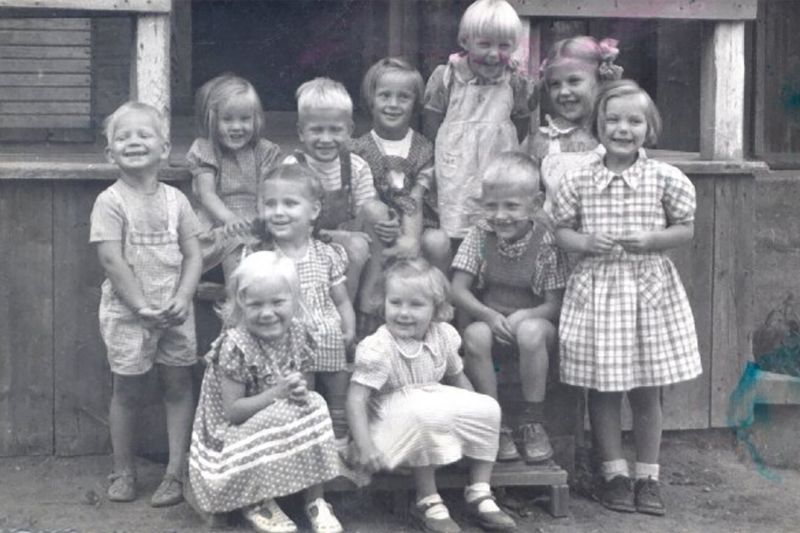 Meidän lapsuudessamme ei vielä ollut minkäänlaista päivähoitoa ainakaan maaseudulla. Mummot ja vanhemmat sisarukset katsoivat perään. Juurikkaan harvennus, heinätyöt ja lehmien ajo laitumelle alkoivat samaan aikaan kuin koulukin.