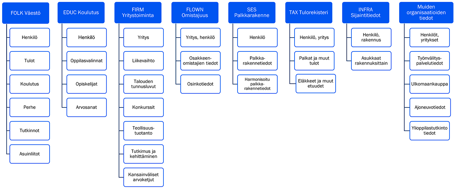 Tämänhetkisiä valmisaineistoja voi tarkastella Tilastokeskuksen Taika-tutkimusaineistokatalogista.