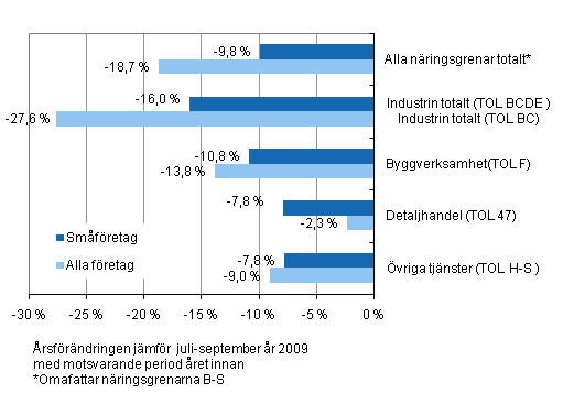 Under juli-september 2009 var skillnaden mellan småföretag och alla företag tydligast inom industrin: omsättningen inom industrinäringsgrenarna föll med omkring 27,5 procent från året innan, men omsättningen för små industriföretag sjönk med omkring 16 procent. Omsättningen inom byggverksamheten gick ned med omkring 13,8 procent, medan nedgången i småföretagen i samma näringsgren var tre procentenheter mindre. Omsättningen för småföretag inom servicebranscherna sjönk med omkring 8 procent.