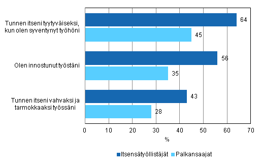 Työn imu on itsensätyöllistäjillä voimakas. Yli puolet sanoo olevansa innostuneita työstään, kun palkansaajista näin kokee runsas kolmannes. Kaikista itsensätyöllistäjistä 43 prosenttia tuntee itsensä vahvaksi ja tarmokkaaksi työssään, kun palkansaajilla vastaava osuus on 28 prosenttia.