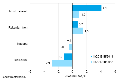 Päätoimialojen liikevaihdon vuosimuutos ajanjaksoilla III/2013–III/2014 ja III/2012–III/2013, % (TOL 2008)