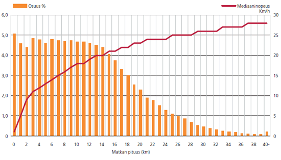 Työmatkan keskinopeudet vaihtelevat työpaikan sijainnin mukaan. Helsingissä työssäkäyvä espoolainen taittaa matkansa tyypillisesti noin 22 kilometrin tuntivauhdilla, kun taas Vantaalla työskentelevä espoolainen kulkee hieman nopeammin, noin 25 kilometrin tuntivauhdilla. Työmatkan pituuden kasvaessa myös työmatkan keskinopeus kasvaa. Alle 10 kilometrin matkoilla keskinopeus jää alle 20 kilometriin tunnissa.
