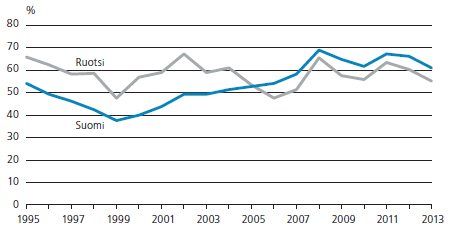 Kotitalouksien lainavelkojen suhde rahoitusvaroihin¹ Suomessa ja Ruotsissa 1995–2013