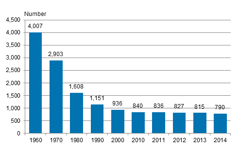 There were 790 public libraries in Finland in 2014, while in 1980 there were still more than 1,600 and good 4,000 in 1960. One major reason for the decrease is municipal mergers, where libraries have been combined into larger units. There are only one-sixth of institutional libraries compared to the 1980s.
