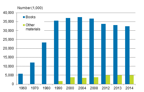 Books still constitute the major part of library collections. Last year, public libraries contained good 33 million books. The number of books was at its highest in 2004, when there were over 37 million of them. As books decrease, the share of other material in library collections has increased to over 11 per cent, while in 1984 the share was still under three per cent.