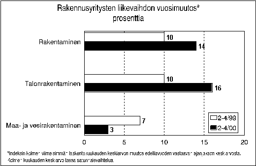Rakennusyritysten liikevaihto oli Tilastokeskuksen mukaan huhtikuussa päättyneellä kolmen kuukauden ajanjaksolla 14 prosenttia suurempi kuin vuotta aiempana vastaavana ajanjaksona. Kasvu nopeutui, sillä vuotta aiemmin se oli 10 prosenttia. Talonrakennusyritysten liikevaihto oli helmi-huhtikuussa 16 prosenttia suurempi vuotta aiempaan verrattuna. Maa- ja vesirakennusalan yritysten liikevaihto kasvoi samana aikana 3 prosenttia.