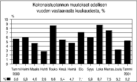 Kokonaistuotannon määrä oli tammikuussa 5,2 prosenttia suurempi kuin vuoden 2000 tammikuussa. Vuoden 2000 joulukuussa tuotanto kasvoi 3,2 prosenttia edellisestä vuodesta. Tilastokeskuksen laskeman kokonaistuotannon kuukausikuvaajan mukaan tuotanto lisääntyi tammikuussa kansantalouden kaikilla päätoimialoilla.