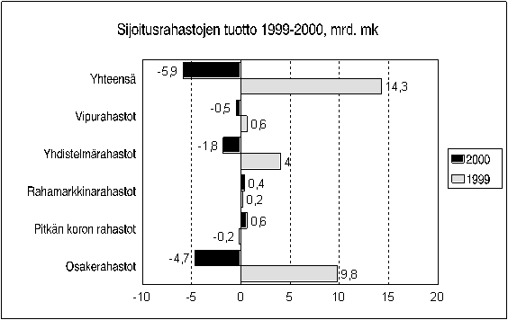 Osakekurssien lasku painoi sijoitusrahastojen yhteenlasketun tuloksen 5,9 miljardia markkaa tappiolliseksi vuonna 2000. Osakerahastojen tilikauden tappio oli 4,7 miljardia markkaa, kun voitto vuotta aiemmin oli lähes 10 miljardia. Yhdistelmärahastojen tappio oli vajaat 2 miljardia markkaa. Vain pitkän koron rahastot ja rahamarkkinarahastot olivat voitollisia. Tiedot käyvät ilmi Tilastokeskuksen sijoitusrahastotilastosta.