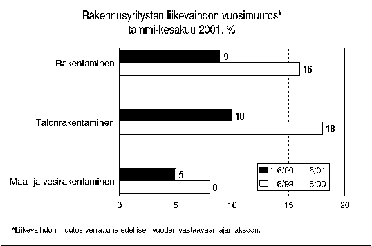 Talonrakennusyritysten liikevaihto oli tammi-kesäkuussa 10 prosenttia suurempi ja maa- ja vesirakennusyritysten liikevaihto 5 prosenttia suurempi kuin vuosi sitten vastaavana aikana.