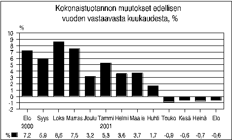 Kokonaistuotannon määrä oli vuoden 2001 elokuussa 0,6 prosenttia pienempi kuin viime vuoden elokuussa. Tilastokeskuksen laskeman kokonaistuotannon kuukausikuvaajan kuudesta päätoimialasta neljän eli alkutuotannon, teollisuuden, rakentamisen ja kaupan tuotanto supistui elokuussa. Julkisten ja muiden palvelujen toimiala kasvoi edelleen. Liikenteen tuotanto pysyi ennallaan edellisvuoden elokuuhun verrattuna. Kokonaistuotanto on kasvanut vuoden 2001 tammi-elokuussa yhteensä 1,4 prosenttia edellisvuoden vastaaviin kuukausiin verrattuna.